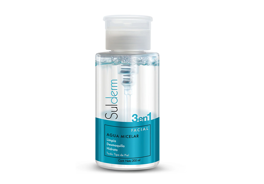 El Agua Micelar Sulderm 3 en 1 limpia, desmaquilla e hidrata la piel en un solo paso. Gracias a sus micelas, atrapa suavemente impurezas, restos de maquillaje y exceso de grasa sin necesidad de frotar ni enjuagar, dejando el rostro perfectamente limpio y fresco. Está formulada para pieles normales a mixtas, incluso sensibles, ya que no reseca ni irrita; al contrario, mantiene la hidratación natural y respeta el pH cutáneo. Reemplaza en un solo gesto al limpiador y tónico convencional, fortaleciendo la barrera de la piel mientras proporciona una sensación de suavidad y confort tras su uso.