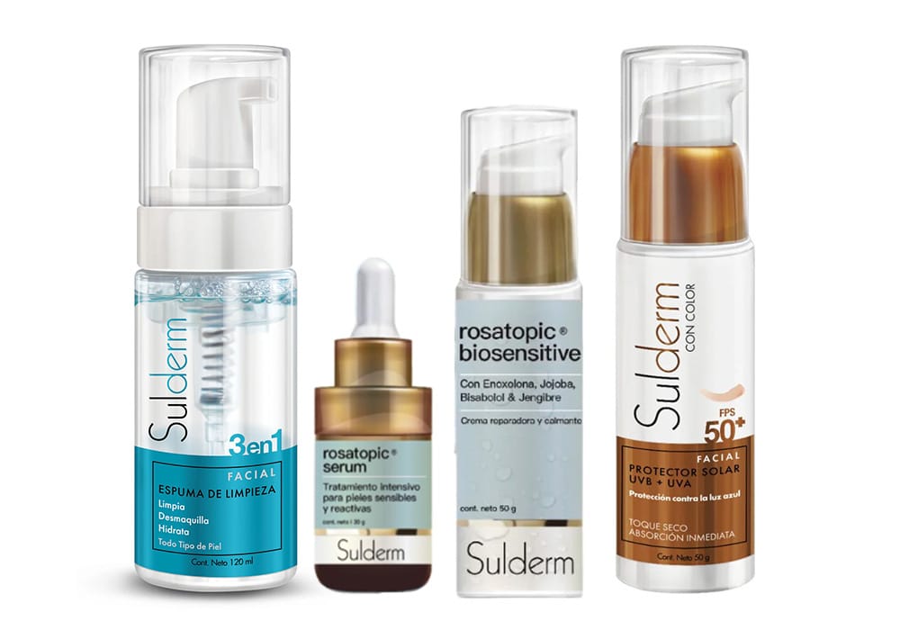 Este combo Sulderm está especialmente formulado para pieles sensibles, reactivas o con rosácea. La Espuma de Limpieza 3 en 1 limpia de manera suave sin irritar, preparando la piel para recibir los activos. El Rosatopic Serum actúa como un tratamiento intensivo calmante que reduce el enrojecimiento, ardor y sensibilidad. El Rosatopic Biosensitive refuerza la barrera cutánea y aporta alivio inmediato gracias a sus ingredientes reparadores y antiinflamatorios. Para completar la rutina, el Protector Solar FPS 50+ con color protege la piel del sol y la luz azul mientras unifica el tono con acabado seco y natural. Un combo ideal para cuidar, calmar y fortalecer pieles delicadas.